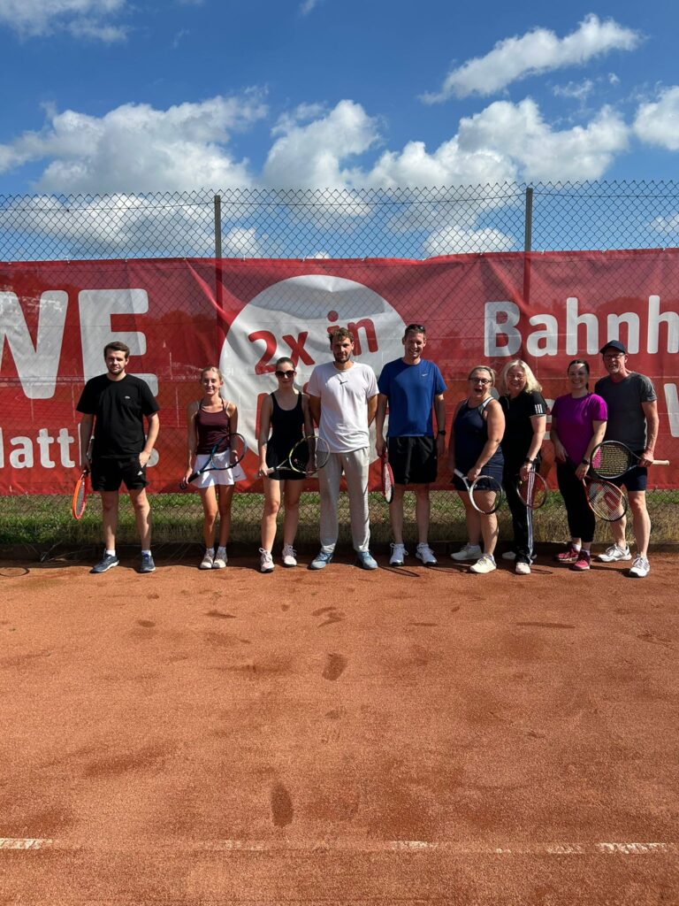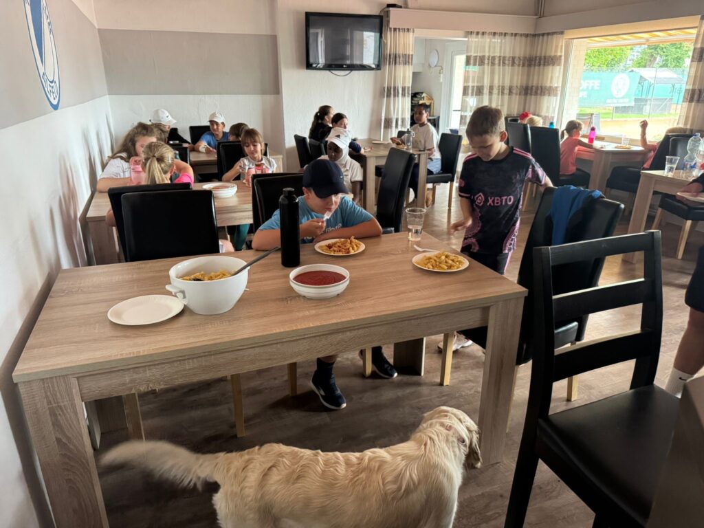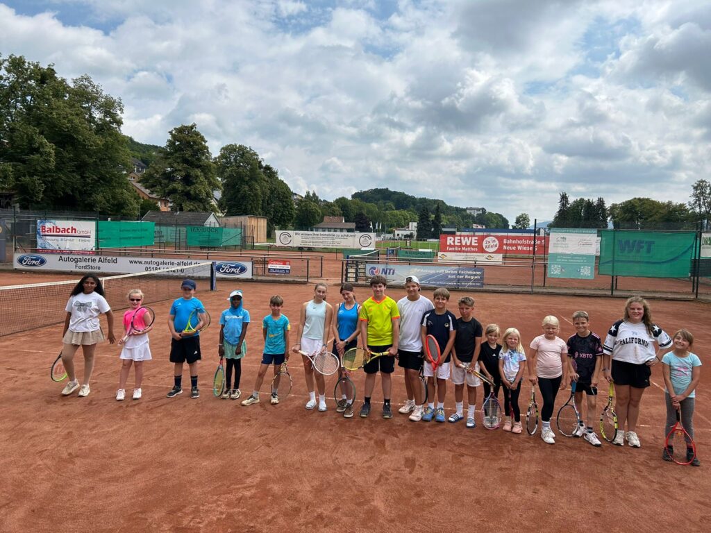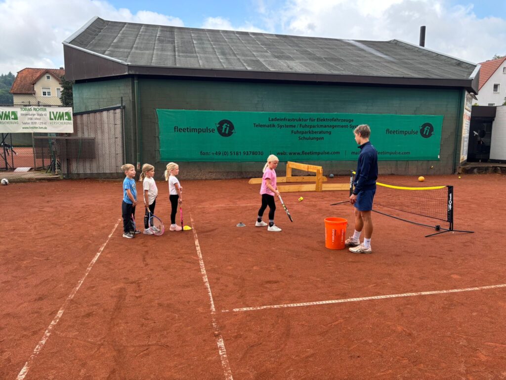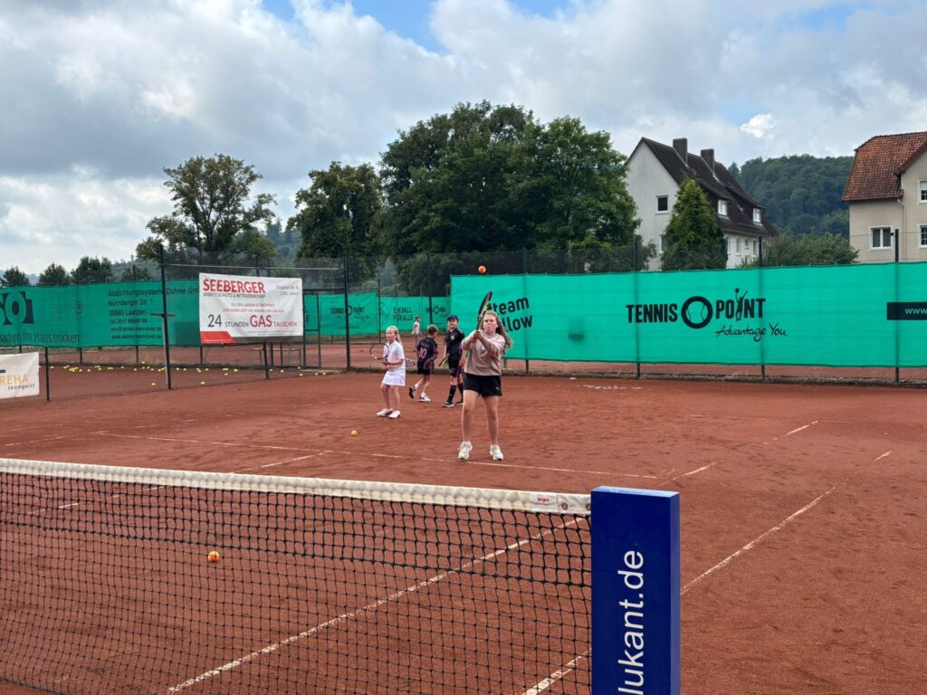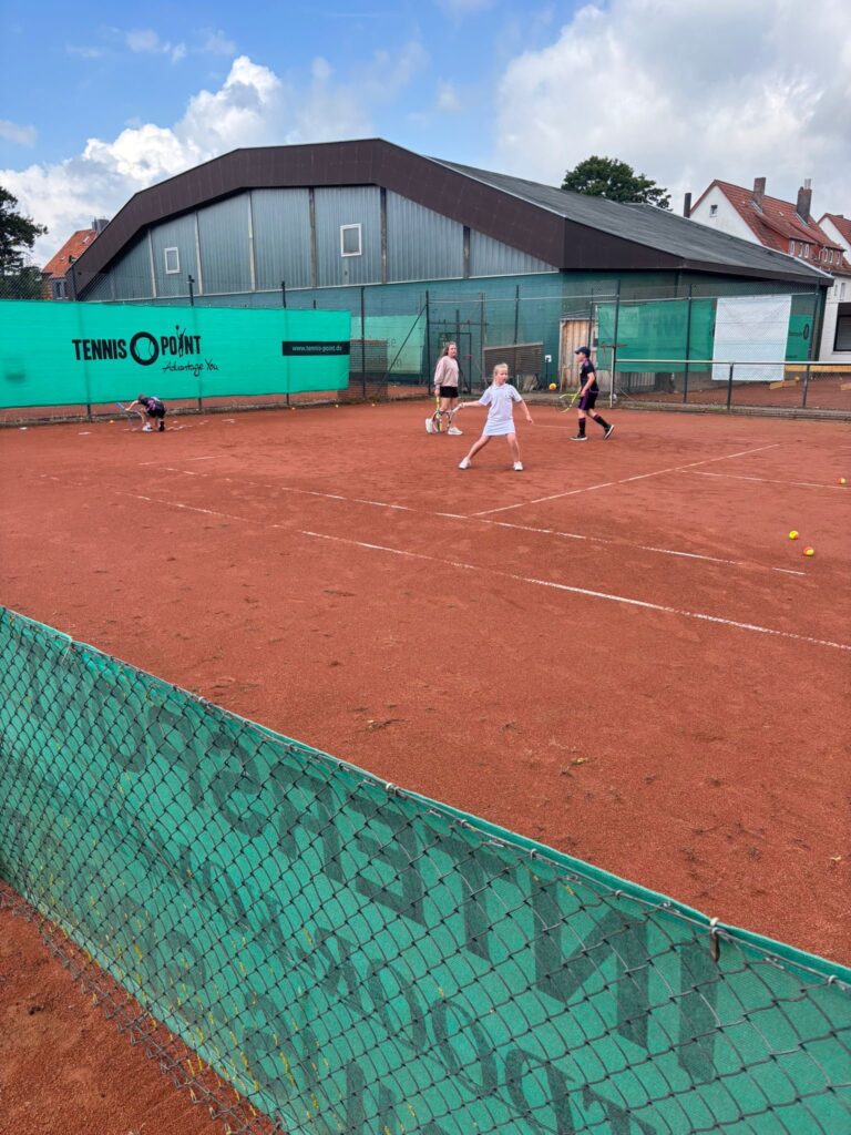 Heute ist Bergfest beim Sommerferiencamp im TCA. Drei Trainer, täglich wechselnde Teilnehmer, gemeinsames Mittagessen und vieles mehr. Täglich sind es rund 20 Kinder, die auch von umliegenden Vereinen dabei sind. Initiator Timo Peters: „Wir schaffen Angebote für Kinder der Region. Somit ist das Camp auch offen für alle.“ Neben Peters sind auch C-Lizenz Inhaber Jannik Brinkmann und Simon Rohmeyer dabei. Die Coaches vermitteln Freude an Bewegung und selbstverständlich auch, je nach Level, an tennisspezifischen Schlagtechniken. Zudem wird die Gemeinschaft gefördert, beispielsweise bei Teamspielen und beim gemeinsamen Mittagessen.